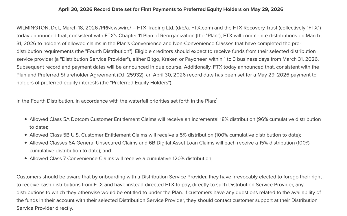 [PRN] FTX Recovery Trust Announces $2.2 Billion Fourth Distribution to Creditors Scheduled for March 31, 2026 https://t.co/kIUdMrlDo5