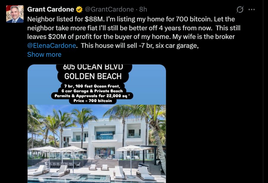 Billionaire Grant Cardone says he's listing his Golden Beach mansion for 700 $BTC, while a neighbor is offering a similar property for $88 million. "Let the neighbor take more Fiat. I'll be even better off in four years." #Bitcoin https://t.co/Xx0a0e2qeU