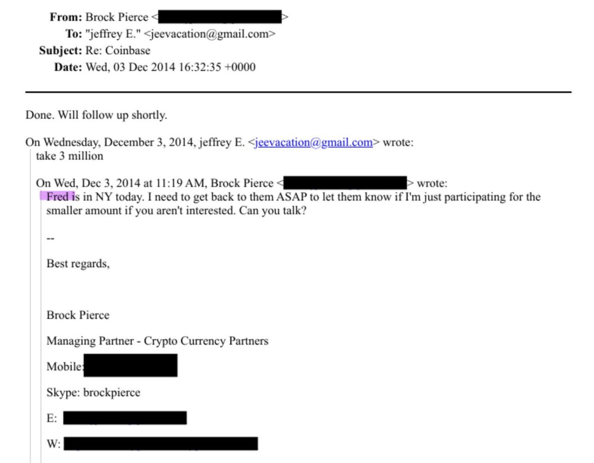 So when Brock Pierce is chatting with Epstein about Coinbase, he mentions, “Fred is in NY”. That’s Fred Ehrsam Co-Founder of Coinbase who started Paradigm with Matt Huang. Matt was the head crypto partner at Sequoia Capital which is HEAVILY tied to the Chinese Communist Party. https://t.co/DrFMfxZ8yT