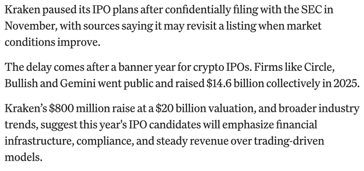 Kraken parent company Payward has paused its IPO plans. Payward confidentially filed its IPO application with the U.S. SEC last November, but has recently suspended the listing process due to weakened crypto market conditions following Bitcoin's record high, which has put https://t.co/u9P2kwoJG3