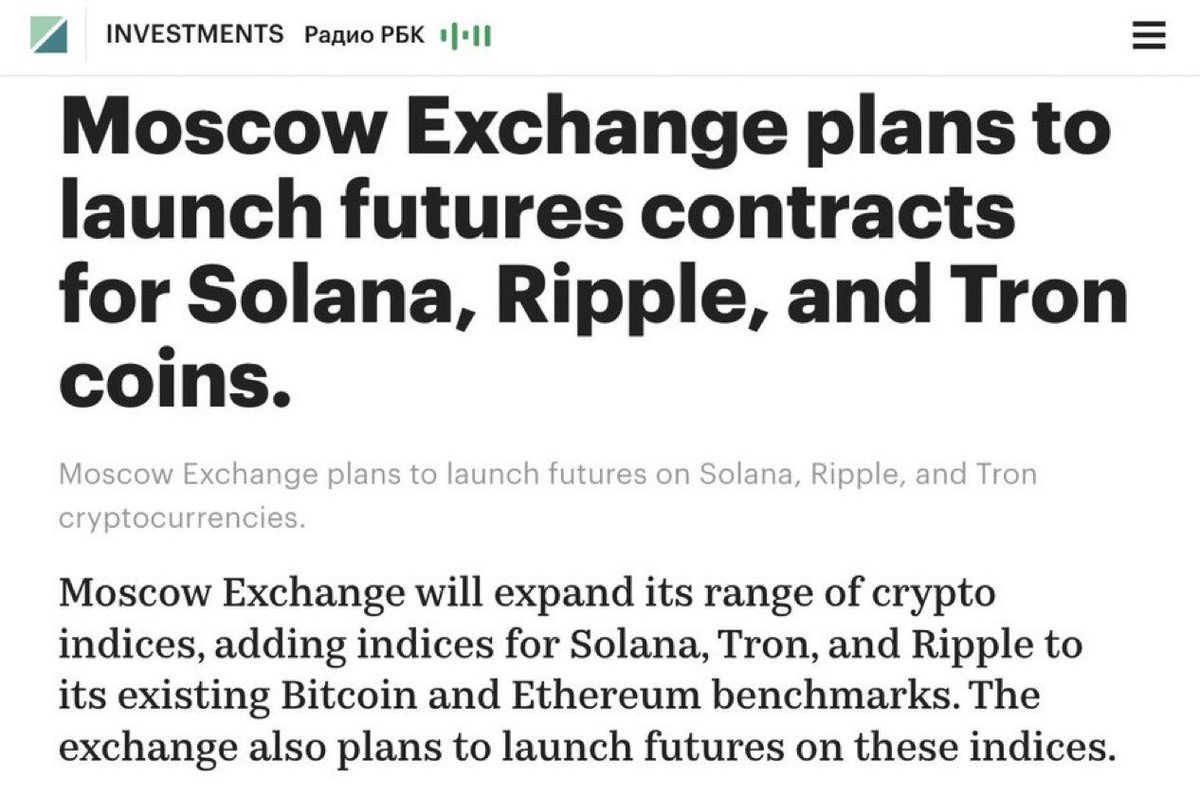 NEW: Russia's largest stock exchange Moscow Exchange, plans to launch $SOL price indices and futures contracts, alongside similar products for $XRP and $TRX. https://t.co/d2FUzWlguQ