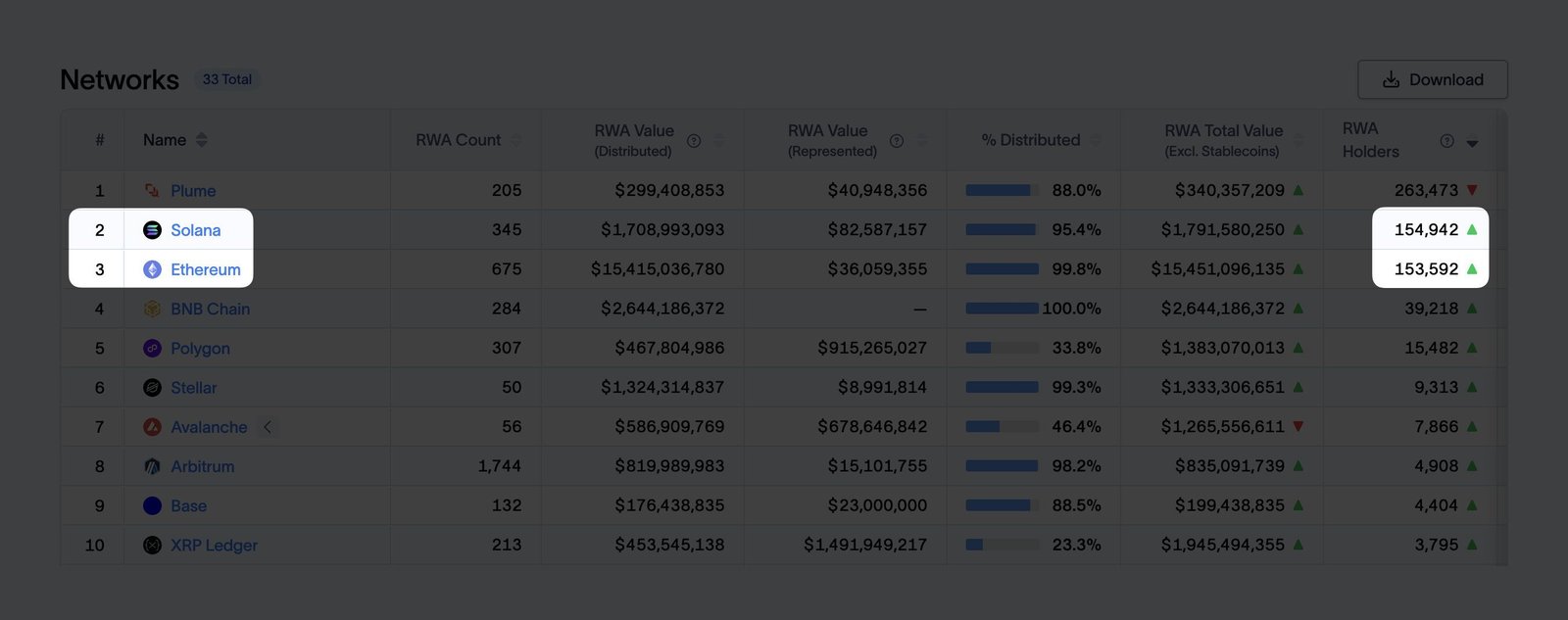 Solana RWA holders surpass Ethereum for the first time, highlighting a shift toward broader participation in tokenized assets.