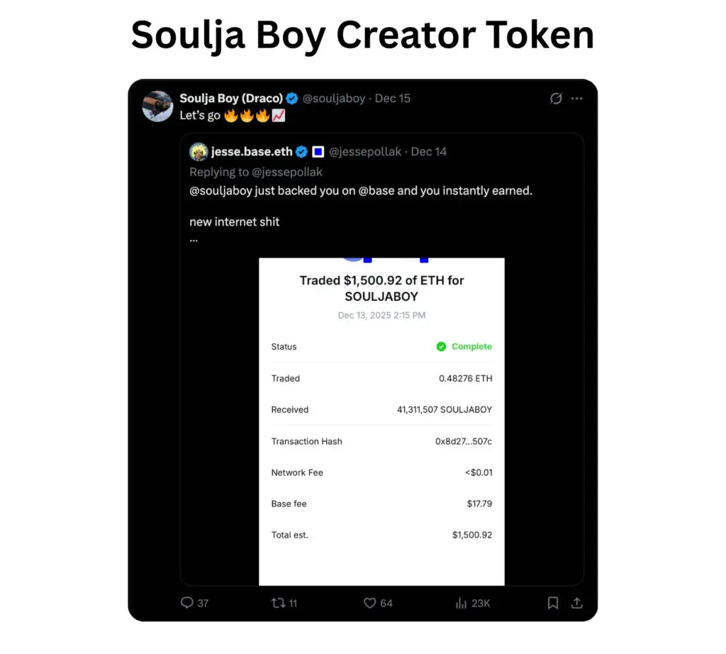 Soulja Boy returned to crypto in December 2025 after a quieter stretch following the regulatory crackdowns. This time, he presented himself as a more serious Web3 creator. He launched a personal creator token on Base, which is Coinbase’s Ethereum Layer 2 network. The token, often called $SOULJABOY, was part of a larger creator monetization concept.