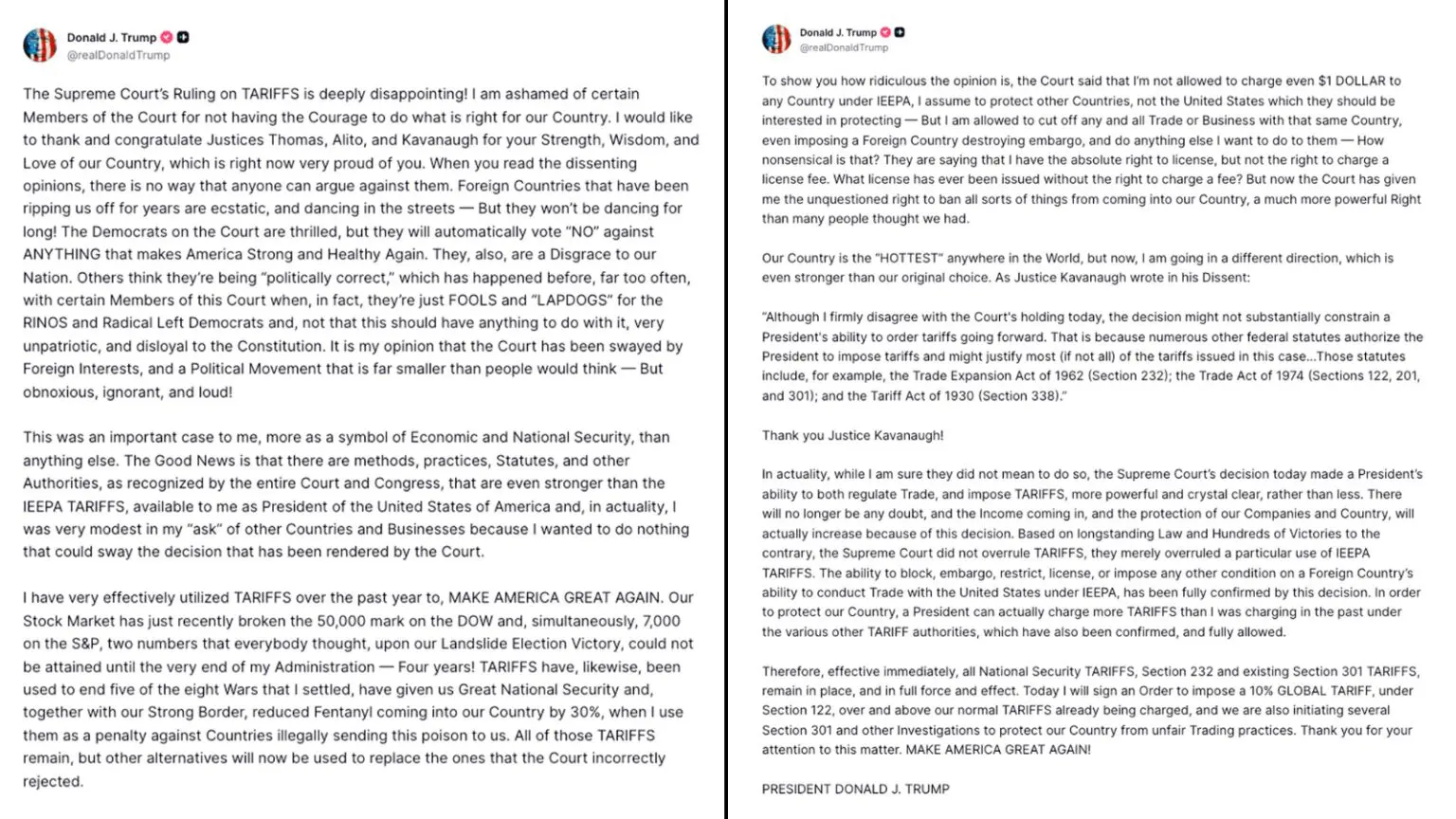 Within hours of the ruling, Trump announced he would issue a new executive order under Section 122 of the Trade Act of 1974. That provision allows temporary surcharges of up to 15% for 150 days to address balance-of-payments concerns.