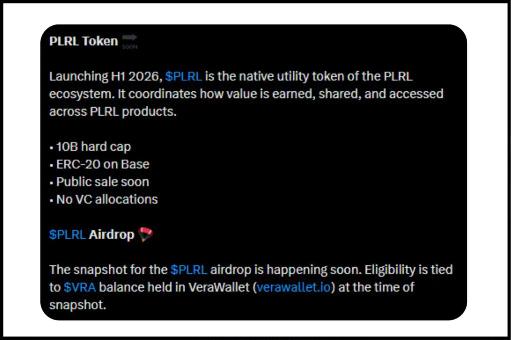 Under the new structure, $VRA remains the utility token for Verasity’s B2B advertising stack, supporting campaigns, Proof-of-View operations, and enterprise scalability. Meanwhile, $PLRL emerges as a separate ERC-20 token on Base, capped at 10 billion supply with minting disabled. The token is positioned as an “Internet Equity Layer,” designed to power consumer-facing products such as a data vault, content marketplace, and AI-driven ad delivery.