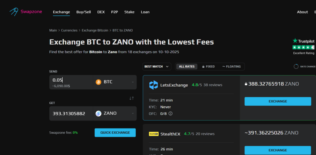 October 10, 2025– Zano ($ZANO) has officially integrated with Swapzone, one of the leading instant crypto exchange aggregators, expanding access to its privacy-focused blockchain ecosystem. The partnership, announced Thursday by the Zano Project on X (formerly Twitter), enables users to swap $ZANO across more than 4,500 supported assets—all without registration, deposits, or delays.